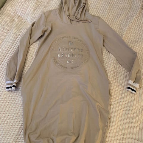 Hyväkuntoinen, harmaa, pidempi huppari.