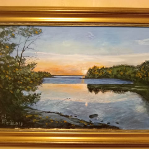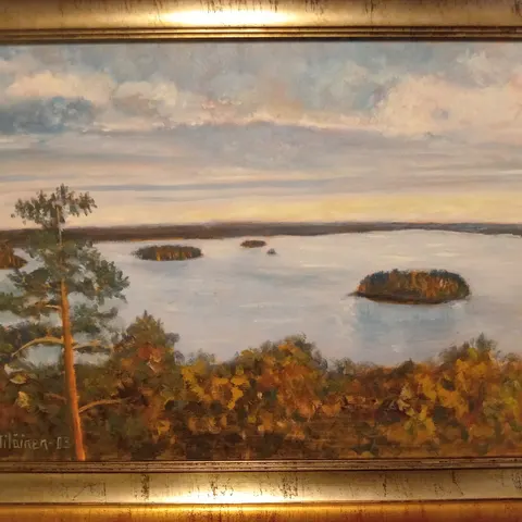 Tamperelaisen taiteilijan Arto Pietiläisen maalaama maisemataulu näkymistä Pispalaan kauniissa kehyksissä, korkeus 59 cm ja leveys 79 cm, nouto tai kuljetus sovittuun paikkaan Tampereella ja sen lähialueilla, SAA TARJOTA