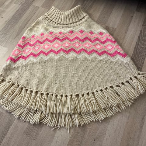 H&M harmaa neulottu poncho tytöille, koko 158. Valmistettu pehmeästä materiaalista, jossa on koristeellinen kuviointi ja hapsut alareunassa. Sopii käytettäväksi viileämpinä päivinä lisälämmikkeenä.