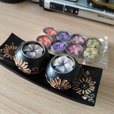 Viiden tuikkuastian ripustettava kynttelikkö. Muoviset koristeet, jotka voi tietysti vaihtaa sellaiseksi kuin haluaa, esim. kristalleihin.