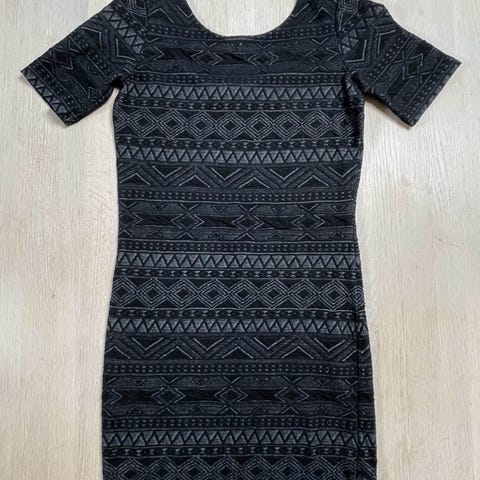 Myynnissä näyttävä ja mukava Boco-merkkinen trikoo-/neuletyyppinen mekko, jossa mustavalkoinen etnishenkinen kuosi ja ihanat kellohihat. Materiaali joustaa hieman ja tuntuu pehmeältä ihoa vasten – sopii niin arkeen kuin rennompaan juhlaan.