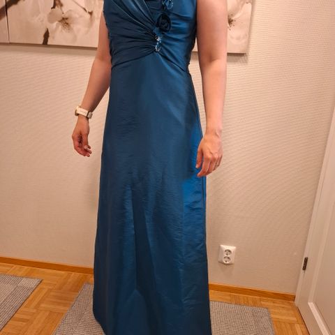 Kerran pojan häissä käytetty iltapuku. Kaunis leikkaus, jossa sinisävyisiä "timantteja". Kovitettu rintaosa. Vuori koko pituudella. Leveä hartialiina puvun kangasta, jolla saa tarvittaessa hartiat hyvin peittoon. Takana pitkä vetoketju. Koko 42, mutta vastaa kokoa 40 mielestäni.