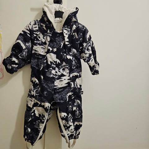 Puvussa saa käännettyä töppöset käsienpäälle ja napitettua lahkeet kiinni. Toimii hyvin makuupussina myös pienemmälle vauvalle vaunuihin.