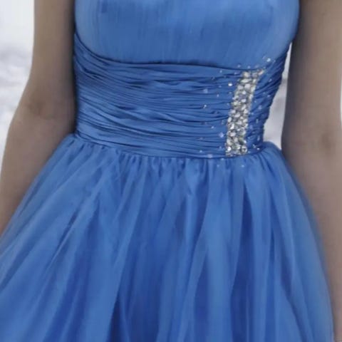Kaunis, hoikan nuoren naisen tukevasti istuva tanssipuku, kaupan päälle annan kullan värisen trassivyön.