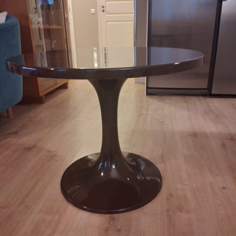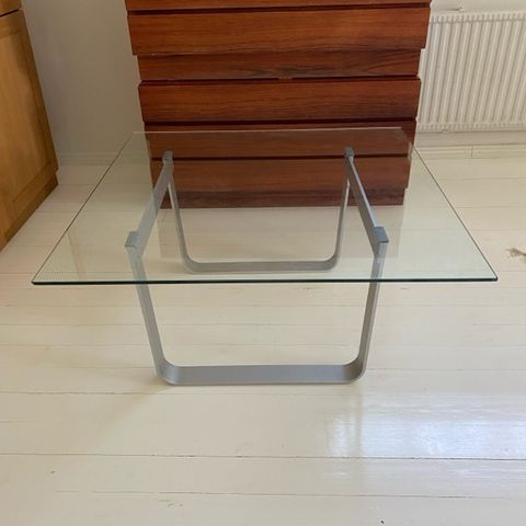 Alumiinirunko, pöydässä tumma lasilevy, n. 72 x 72 cm, korkeus n. 41 cm.