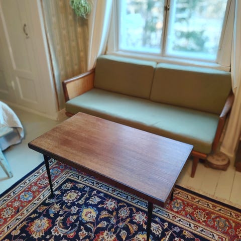 Sopivan matala ”Pulkka” sohvapöytä. Suunnittelija Ilmari Lappalainen. Valmistaja Asko. 1900-luvun puoliväli