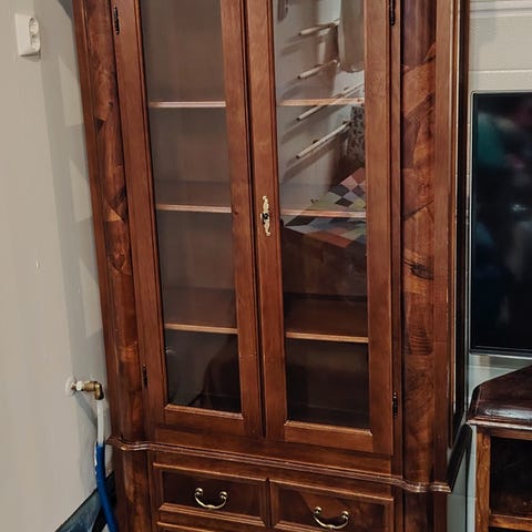 Antiikkityylinen puinen vitriinikaappi lasiovilla