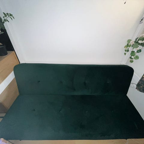 Myydään vähällä käytöllä ollut hieno kolmen istuttava vuodesohva. Verhoilu tummanvihreää samettikangasta.