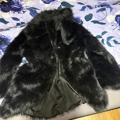 Vähällä käytöllä ollut kerman sävyinen karvatakki, sivuilla avotaskut, takin saa kiinni huomaamattomilla hakasilla.
