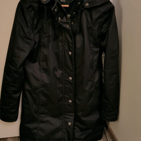 Kerran ollut päällä. Aivan ihana, mutta itselle liian pieni. Todella iso huppu, jonka saa taitettua selkäpuolelle. Lyhyt takkimalli. Kiiltävä kangas.