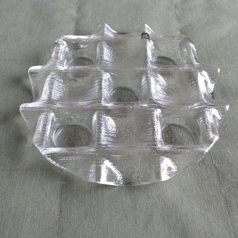 Muurlan valmistama lasinen tuikkualusta tai kynttilänjalka. Ulkohalkaisija noin 13 cm, tasaisen sisäosan halkaisija noin 5 cm. Moitteettomassa kunnossa.