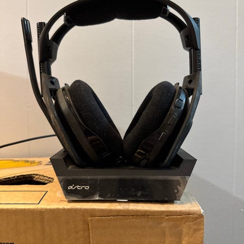 Astro A50 Wireless pelikuulokkeet, musta väri. Langaton yhteys, mukana latausasema. Kuulokkeet on suunniteltu erityisesti pelaamiseen ja ne tarjoavat 7.1-surround-äänen. Mukana USB-kaapeli latausta ja yhteyttä varten.
