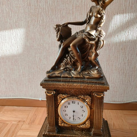 Seinäkello, jossa on koristeellinen kulta väri ja perinteinen pyöreä kellotaulu. Kellossa on arabialaiset numerot ja mustat osoittimet. Kellon materiaalion puuta.