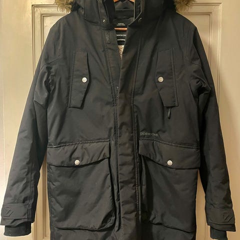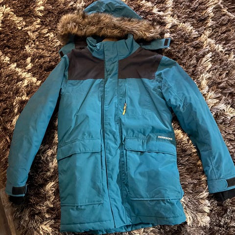 Lähes käyttämätön huoullinen Didriksons toppatakki, 170cm (pientä kokoa, meillä käytti n 150 senttinen). Irrotettava karvakaulus. Takaa hieman pidempi, kiristysnauha vyötäröllä ja helmassa. Menee sekä tytölle että pojalle. Koirakoti.