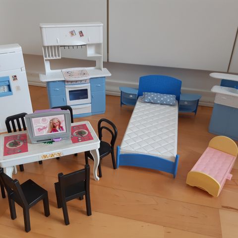 Barbie nukke ja kalusteita sisältäen vuoteen, pöydän, tuoleja sekä erilaisia ruokatarvikkeita.
