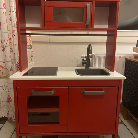 Ikean leikkikeittiö sekä kaikki kuvissa näkyvät leikkiruuat ja keittiötarvikkeet. Keittiön puuosat maalattu uutena valkoiseksi ja taso päällystetty dc-fix muovilla (marmorikuvio)