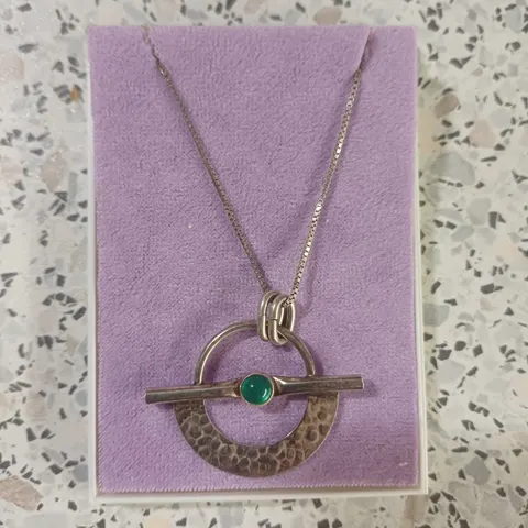 Kaunis hopeakaulakoru, lukossa 925-leima, pituus 68 cm, kivinä ruskeankirjavat akaatit. Yhden akaatin pituus 16 mm.