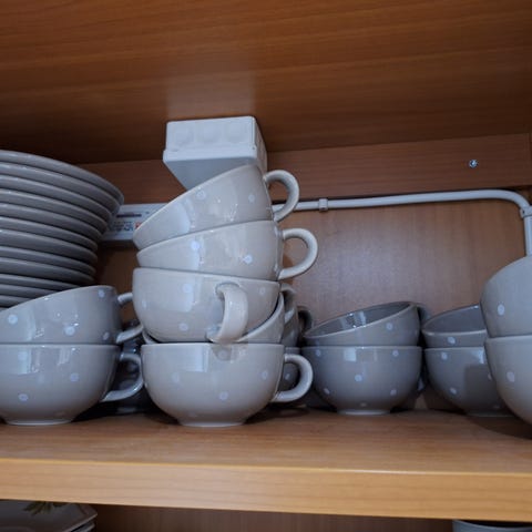 Kahviastiasto. 5kuppia(mistä yhdessä lohkeama). Kahvikannu& kermakko& sokerikko(mistä puuttuu kansi). Kannun korkeus 21cm.