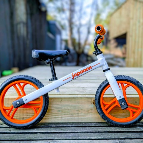 Elämää nähnyt mutta toimiva Joponen 12 tuuman potkupyörä. Käsikahvat ja kello vaihdettu kesällä 2025. Penkistä lähteny palanen ja rungossa kulumisen jälkiä. Täyskumiset renkaat hyvässä kunnossa.