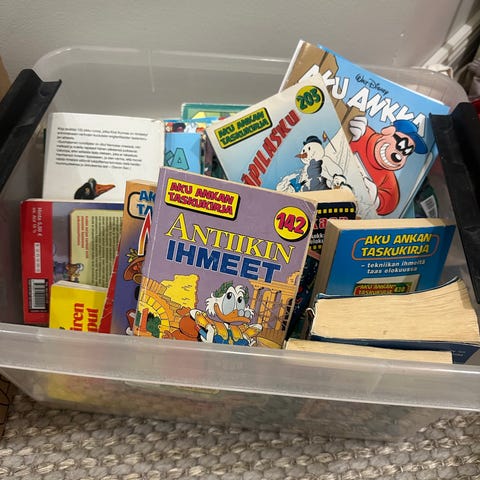 Kuvissa näkyy mitkä numerot (laatikon kannessa tussilla kirjoitettu mm.). Kunto vaihtelee hyvä, KOHTALAINEN - HUONO. Ei pitäisi puuttua hirveästi sivuja, mutta mahdollista, koska joissain irtoamassa jotkin sivut. 1-3 painoksia. Voi kysyä tarkemmin kokoelmasta. Päälle kaksi Aku Ankan sarjakuva erikoisnumeroa: pocahontas ja Kalevala Aku.