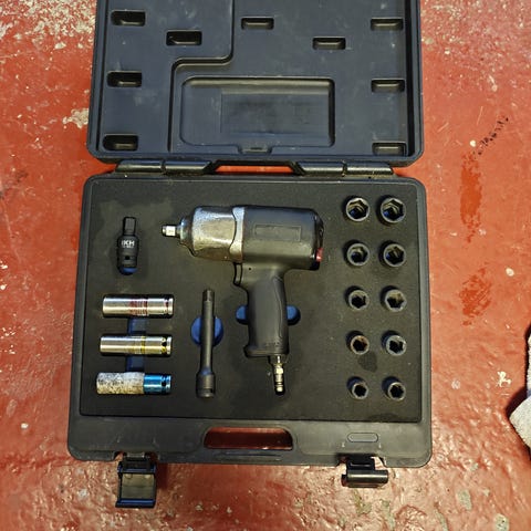 Mutterinväännin hylsysarjalla. Alkuperäinen öljy puuttuu. Kokeiltu, mutta oma kompura oli tälle liian tehoton. Kuvista poiketen mukana kaikki 10 hylsyä. Hylsyistä vain 2-3 käytetty.