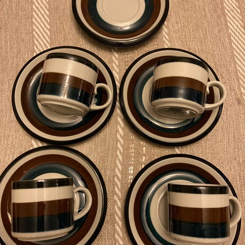 Anja Jaatinen-Winquistin suunnittelema kahvikuppisetti 70-luvulta. Asitaatossa hieman käytön jälkiä. Merkittävimpänä kahden kupin ylälaidassa pienet säröt.