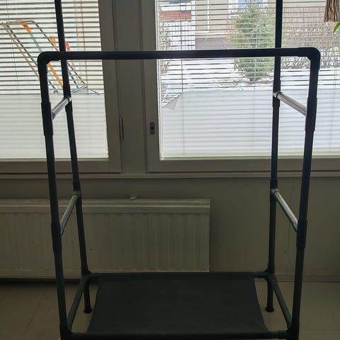 Lasten valkoinen vaatenaulakko. Alhaalla kenkäteline ja pieni penkki, takille naulakko, hylly hanskoille ja pipolle, sekä pieni kaappi ylhäällä. Kiinnitettävä seinään ettei kaadu. Korkeus jalkojen kanssa noin 174.5cm, ilman jalkoja 159.5 cm ja leveys on noin 60.5 cm. Hyllyjen syvyys on noin 30 cm ja "istuinhyllyn" syvyys on noin 40cm.