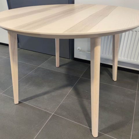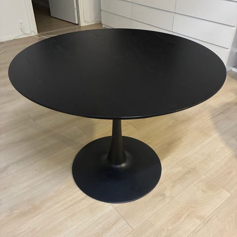 Ikean pyöreä 80cm ruokapöytä. Ollut käytössä n. 3 vuotta, eli perus pieniä käytön jälkiä on :) Yleisilme siisti. Kuvissa näkee valoa vasten pieniä kolhuja ja pöydän reunassa pientä vaaleata jälkeä. Kolhut/naarmut näkyvät parhaiten valoa vasten. Vain nouto :)