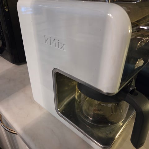 Keitin on pesty kalkinpoistoaineella ja pyyhitty. Mukaan saa halutessaan koneeseen sopivan pestävän kestosuodatinpussin joka on käytössä jonkin verran värjääntynyt.
