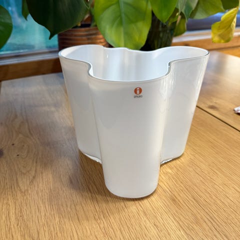 Iittalan, kirkas Aalto- maljakko, 16 cm. Pohjassa Alvar Aalto nimi painettuna.