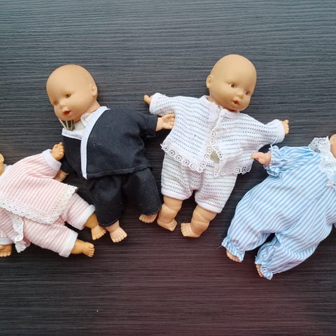 Myydään kaksi vauvanukkea leluineen, pehmeät vartalot, vähän käytetty.
