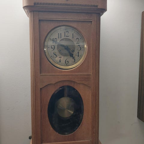 Tyylikäs seinäkello saksalaisella Becker-koneistolla. Täydellinen huolto ja puhdistus teetetty kellosepällä kesällä 2024. Korkeus 130 cm, leveys 40 cm, kellotaulun halkaisija 20 cm, heilurin pituus 50 cm, punnuksen pituus 14 cm ja punnuksen halkaisija 4,5 cm.. Myydään, koska suunnitelmissa muutto omakotitalosta pienempään asuntoon.