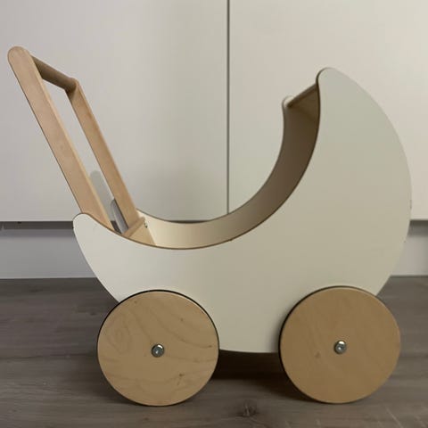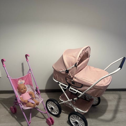 Sadesuoja, aurinkovarjo (ollut oikean vauvan rattaissa joskus), ei kuulu näihin rattaisiin mutta saa mukaan ohuen hoitolaukun.
