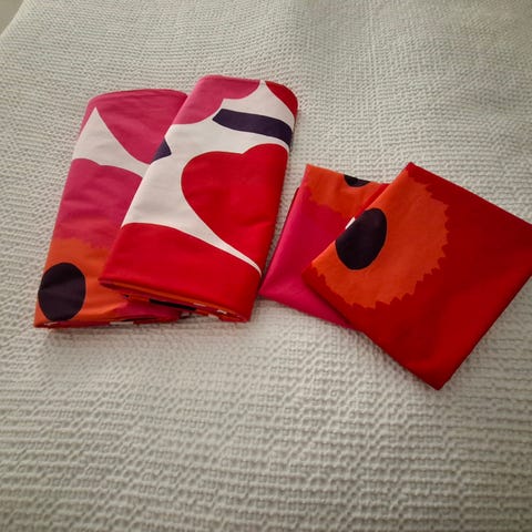 Ostetaan kuvassa olevat Marimekon vaaleansiniset ja siniset Unikko ja Raita - pussilakanasetit kahdelle eli 2 pussilakanaa ja 2 tyynyliinaa per kuosi.