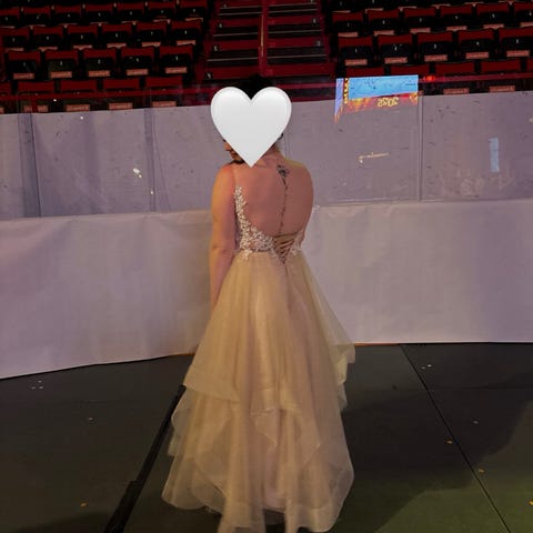 Myydään kaunis, kerran käytetty vanhojen tanssi mekko + mekon alle puettava vannehame. Mekko kuvassa neidolla, joka on 160cm pitkä ja 55kg.