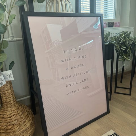 Desenion juliste 50x70cm ja ikean mustat kehykset 53x73cm, valoa vasten kehyksessä pari naarmua