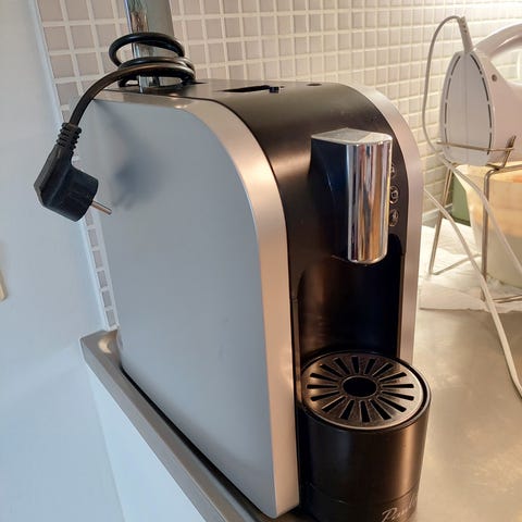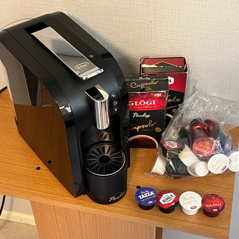 Paulig kapseli kahvikone musta väri. Keittää pienen ja ison kupin ja tulee hyvää kahvia kuin myös kaakaota. Laitteessa on kolme painiketta eri kahvityypeille ja irrotettava veden säiliö. Kaytetty vain kerran, mutta on ollut keitoissa esille, joten todella pieni jälki on, mikä ei näy käytössä.