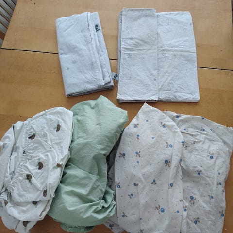 Myyn Näitä settinä, yksitellen tai ristiin, lisää pussilakanoita, muotoon ommeltuja lakanoita, tyynyt 2 kpl, peitto ja huppupyyhkeitä omissa ilmoituksissaan.