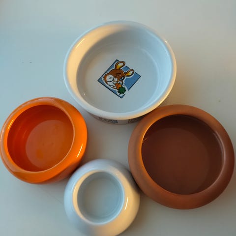 Muovinen heinäkaukalo ja ruokakippo. Metallinen pallo heinälle, salaatille, vihanneksille.