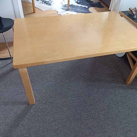 Tarpeettomana Artek 84 pöytä. Taso hienossa kunnossa, reunojen puulistoissa normaalia kulumaa, yksi vähän isompi jälki joka näkyy kuvassa. Yksi jalkojen kiinnityksistä tasoon hieman löysä.