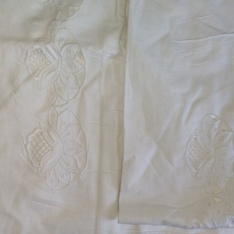 Hienot käsintehdyt reikä- ja koristeompeleet yhdessä reunassa, vaivaa on nähty!