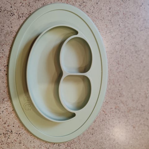 Hyväkuntoinen silikonilautanen, jota pikku piltti ei pysty kaatamaan.