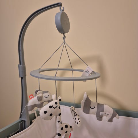 Sänkyyn kiinnitettävä lasten mobile. Soiva. Soivan osan voi ottaa välistä pois.