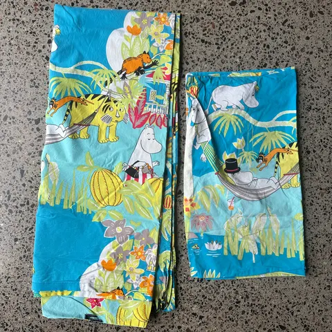 Myydään ruusumuumi kuosinen juniorkoon pussilakana (sain mittauksella 115cm*150cm) ja normaalikokoinen tyynyliina. Ei moitteita.