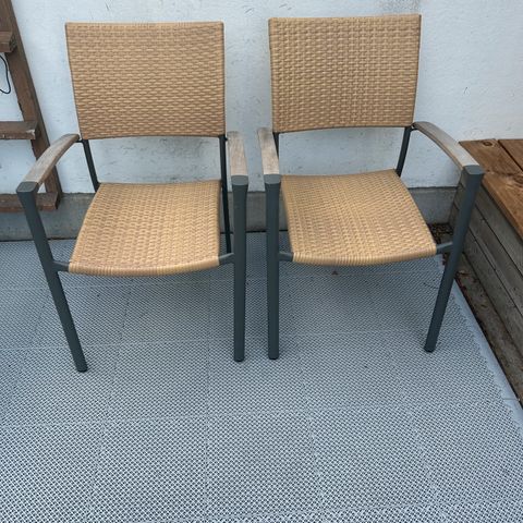 Puutarhatuoli, istuin- ja selkäosa punottua materiaalia, kehikko metallia, liikuteltavat käsinojat. Hyvä kunto, ollut sisävarastossa. Koiratalous.