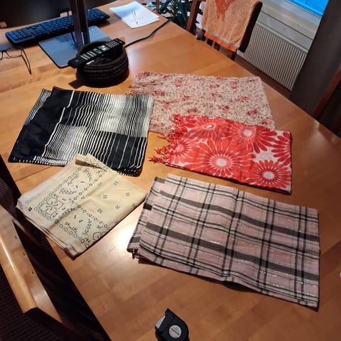5 huivia, 1 pitkä ohut 35 ×175 cm, muut paksuhkoja. Materiaalilappuja ei tallella. Koot kuvissa. Koko setin hinta 10euroa, yksittäin 3 € /kpl, tai 0 euroa kpl muun ostoksen minimi 4 euroa yhteydessä.
