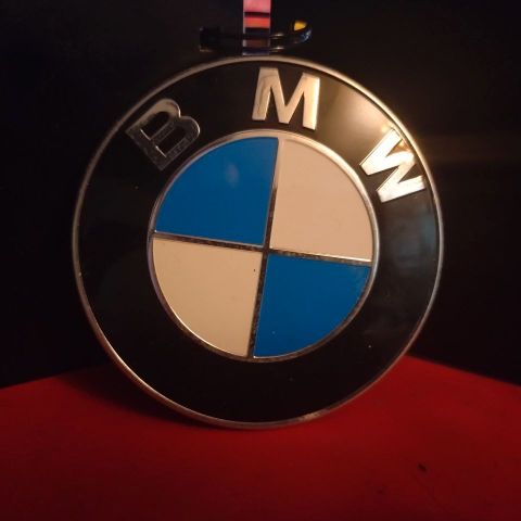 BMW auton merkki, halkaisija 74 mm, musta pohja valkoisella tekstillä. Valmistettu kestävästä materiaalista, sopii auton ulkopuolelle. Merkissä näkyy BMW-logo ja valmistustiedot takapuolella.