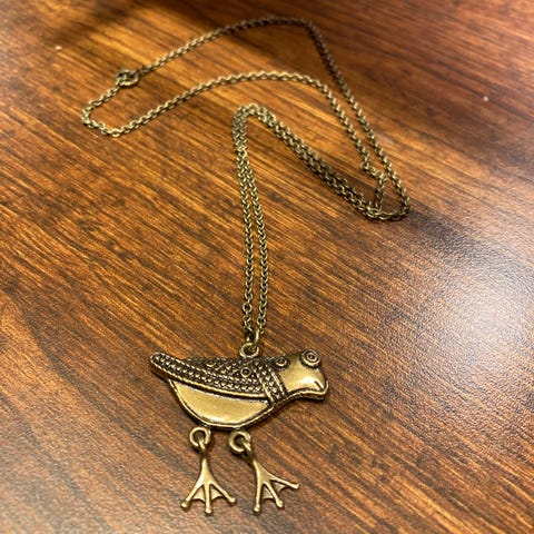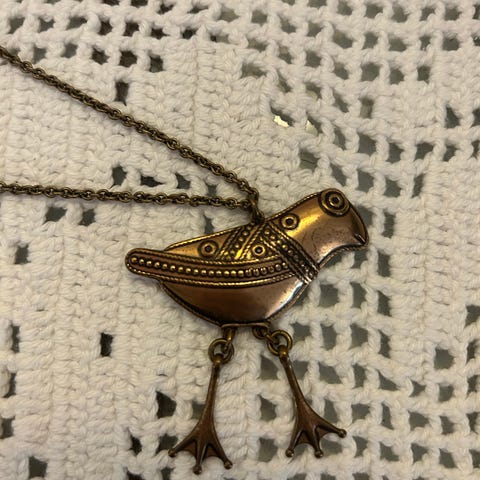 Pronssinen Hattulan lintu riipus pitkässä ketjussa. 55€