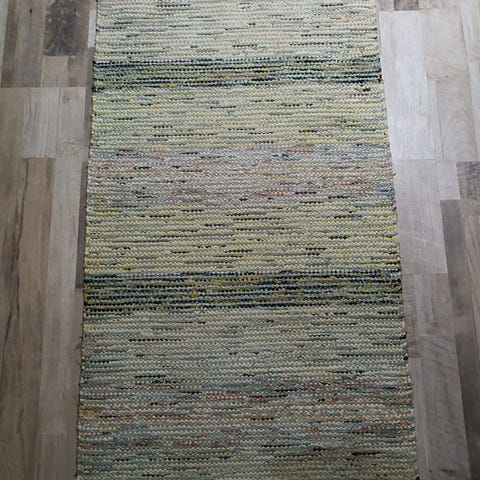 Sinisävyinen. Itse kudottu matto. Uutta, mutta myös jonkin verran leikattua kudetta mukana. Kohokuviot toisella puolella molemmissa päissä. Koko 87 cm x 243 cm + hapsut. Nouto tai toimitus sopimuksen mukaan. Huom! Viikolla 41 onnistuu myös nouto Järvenpäästä.
