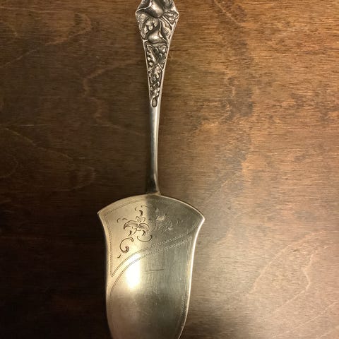 Kultakeskuksen perinteinen vanha kakkulapio. Sopii myös piirakoihin. Art nouveau- tyylinen koristelu.